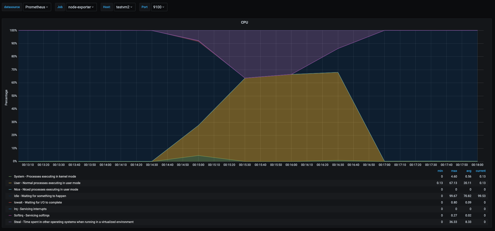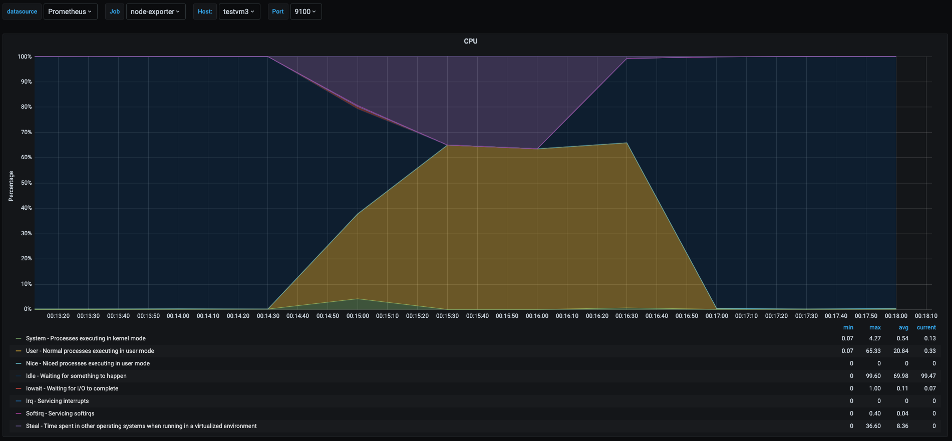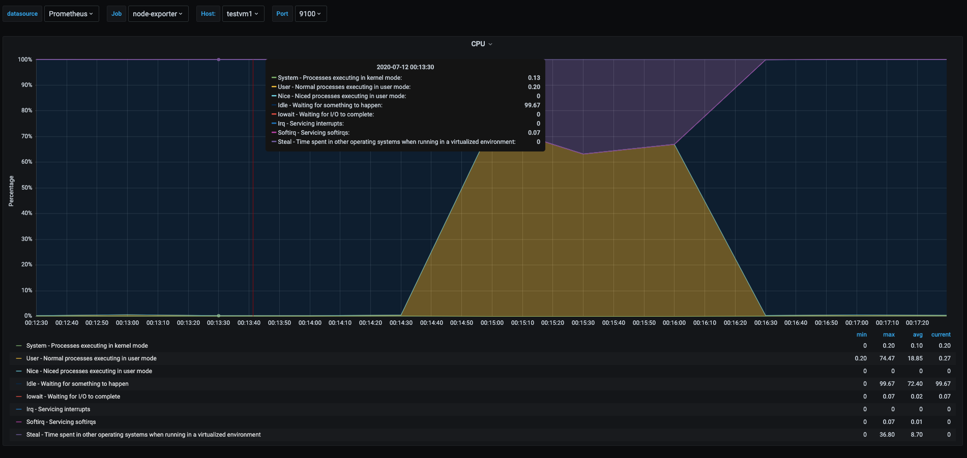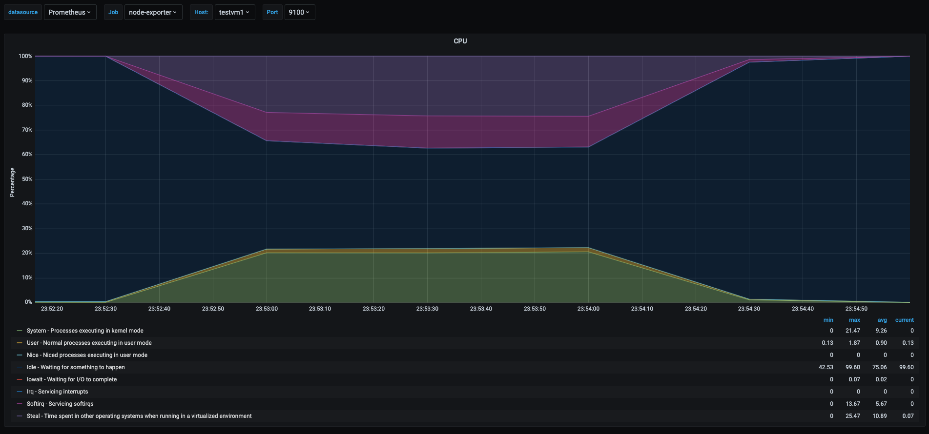 In the graph we can see during the stress test of the cpu, the testvm1 spiked the user space usage, shown as the yellow area, off course the stress test took all available cpu at the time of the test, but we can see a tiny spike in the green area which shows the time spent in kernel space processes, this is because even userspace processes can have interaction with the kernel depending on the tasks the process is doing.