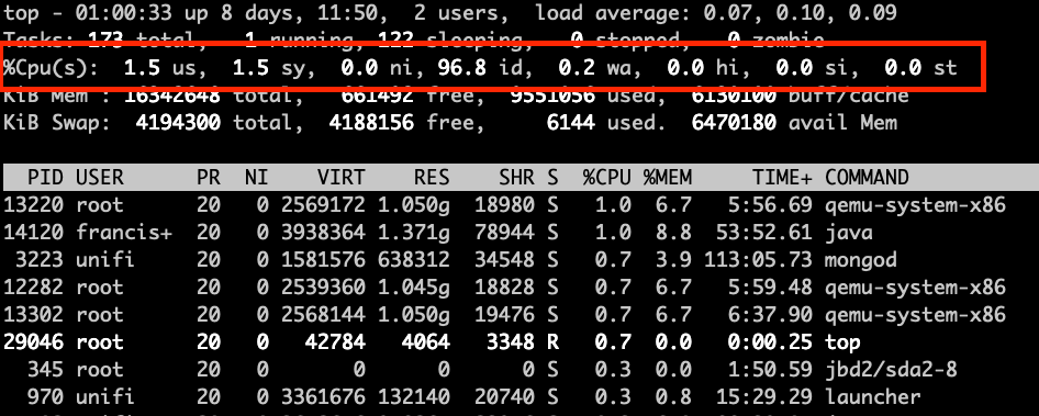 CPU metrics in the top command show the percentage spent in each one of this “states”, we will talk more about what they are.