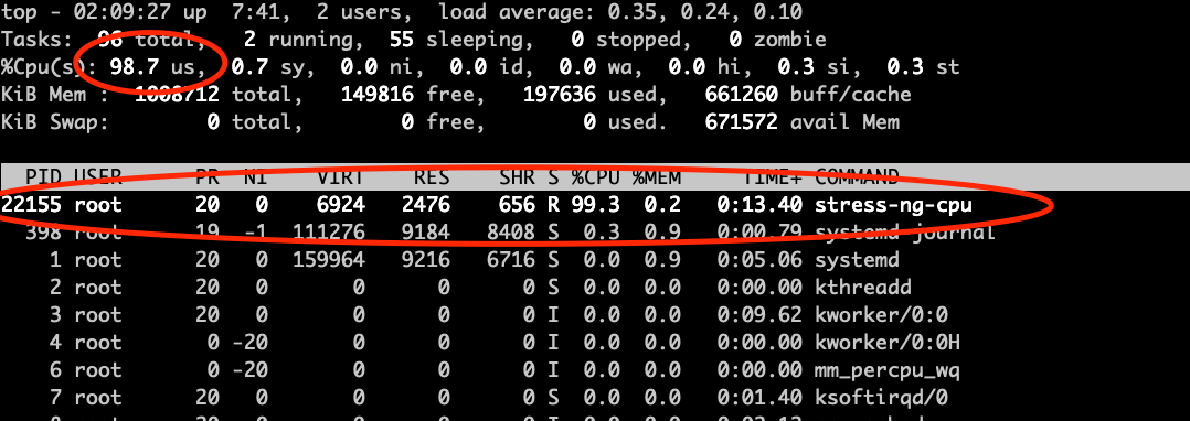 us a.k.a user: this is the cpu time used by userspace processes. Most applications will show up within this percentage when they are using cpu.sy a.k.a system: this is the cpu time spend by kernel processes, every time there is interaction from user space processes, or I/O, or processing network traffic; anything that need to interact with the kernel will show up within this percentage.ni a.k.a. nice: this is the cpu time spent by userspace processes that had been niced. Setting nice to a process will control the priority this process, this can be used to set priority lower when the process is invasive, or set to higher priority when the process need more guaranteed cpu time, for example realtime applications. When a userspace process has been set with nice it will show in this metric.id a.k.a. idle: this is the time where the cpu was idle, pretty much waiting to be used. In busy systems this will have a low value, and in not busy systems this will be high.wa a.k.a. iowait: this is the time that the cpu was spent by waiting for I/O to happen. This value will be high when there is a lot of access to disk or accessing hardware. But mostly will be when we are doing heavy reading/writing to disk.hi a.k.a hardware interrupt or si a.k.a. software interrupt: This is the time the cpu spent processing interrupts, interrupts can be processed also by software with processes called softirqd or when the kernel spent time processing a hardware interrupt. Either hi and si will mean that there is interaction with hardware happening. A normal case would be that this will spike when having high network traffic as the network card will generate lots of interrupts and it will affect the cpu usage.st a.k.a. steal: this is the time spent waiting to get cpu time. This value will only show up when running in virtualized environments. The steal value means that someone else (a.k.a another virtual machine most likely) was using the cpu in this time, this happens when multiple virtual machines are sharing the same cores. It’s a very interesting metric to watch, specially when we are running vm’s in the cloud or when we run virtual machines. Helps identify if the underlying host is oversubscribed or identify “noisy neighbors”.Next I will do some tests to try to spike each one of the values and show some situations that we might find in cpu metrics which will help us understand more the usage in the server we are watching. I will also show some situations that I recorded in my home lab doing other tests.